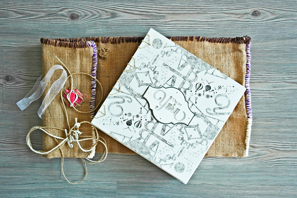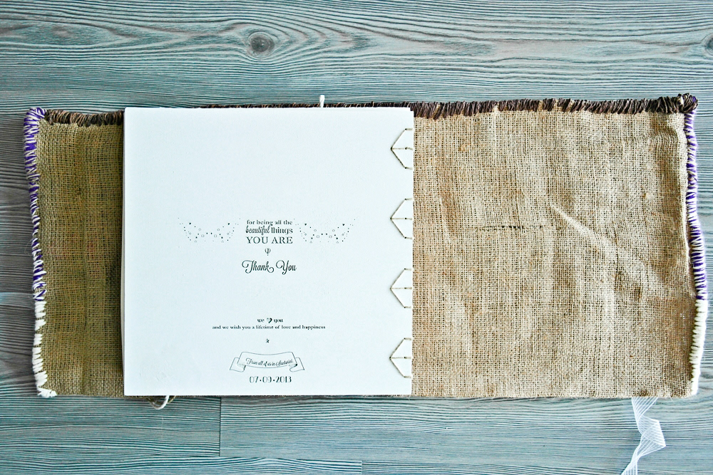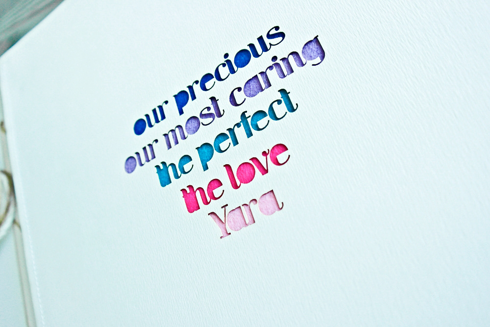 The golden book is made of 5 sections dedicated for guests to write down their wishes for the bride. The cover is engraved, the section dividers are laser-cut and sewn with felt. The coptic binding allows for the book to open flat despite its thickness.