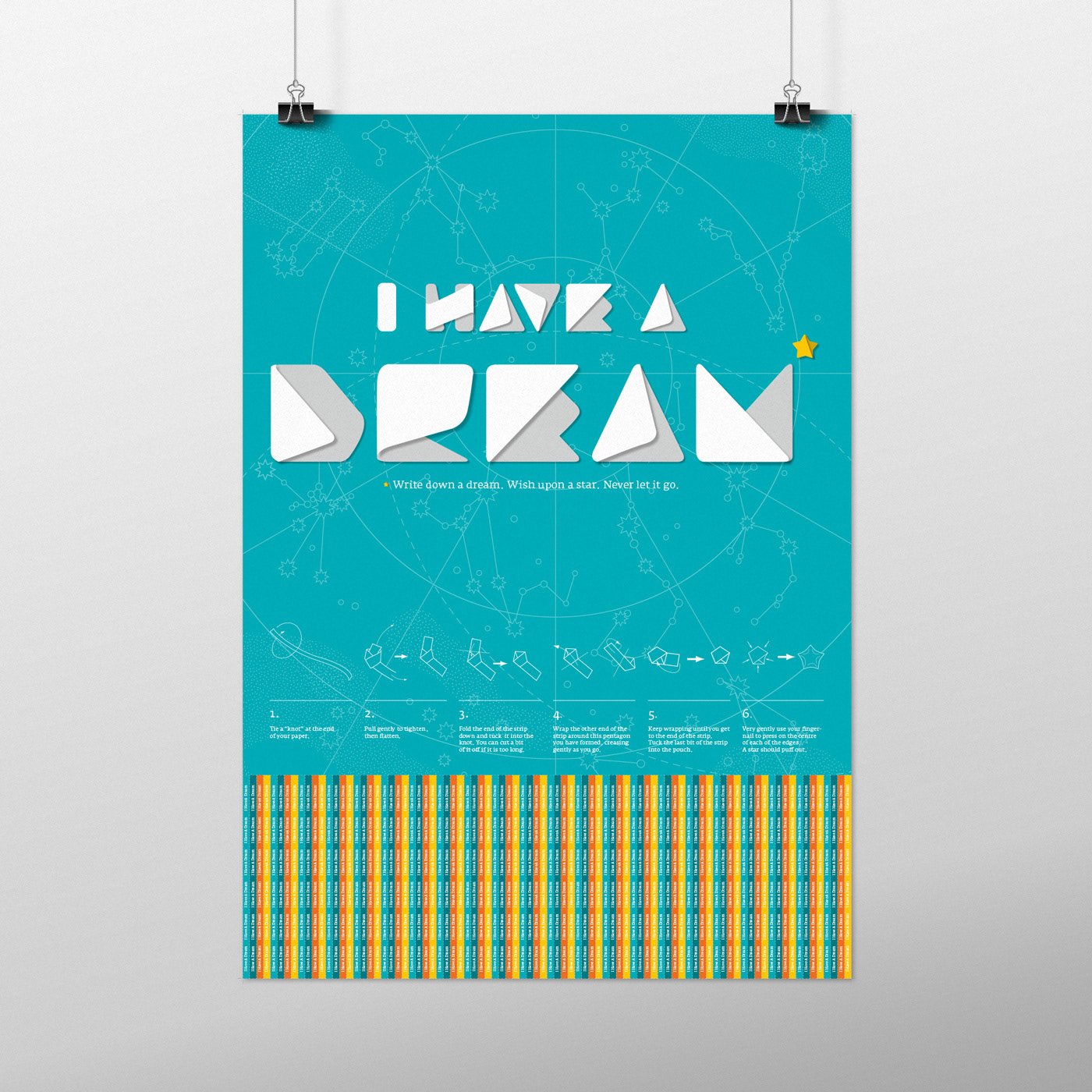 A poster designed based on Martin Luther King Jr's "I have a Dream" speech. Peel a strip, wish upon a star, fold it as per the instructions to get your lucky star. Never let it go. As the strips are ripped from the poster, the original speech appears underneath. Professor: Tom Wedell